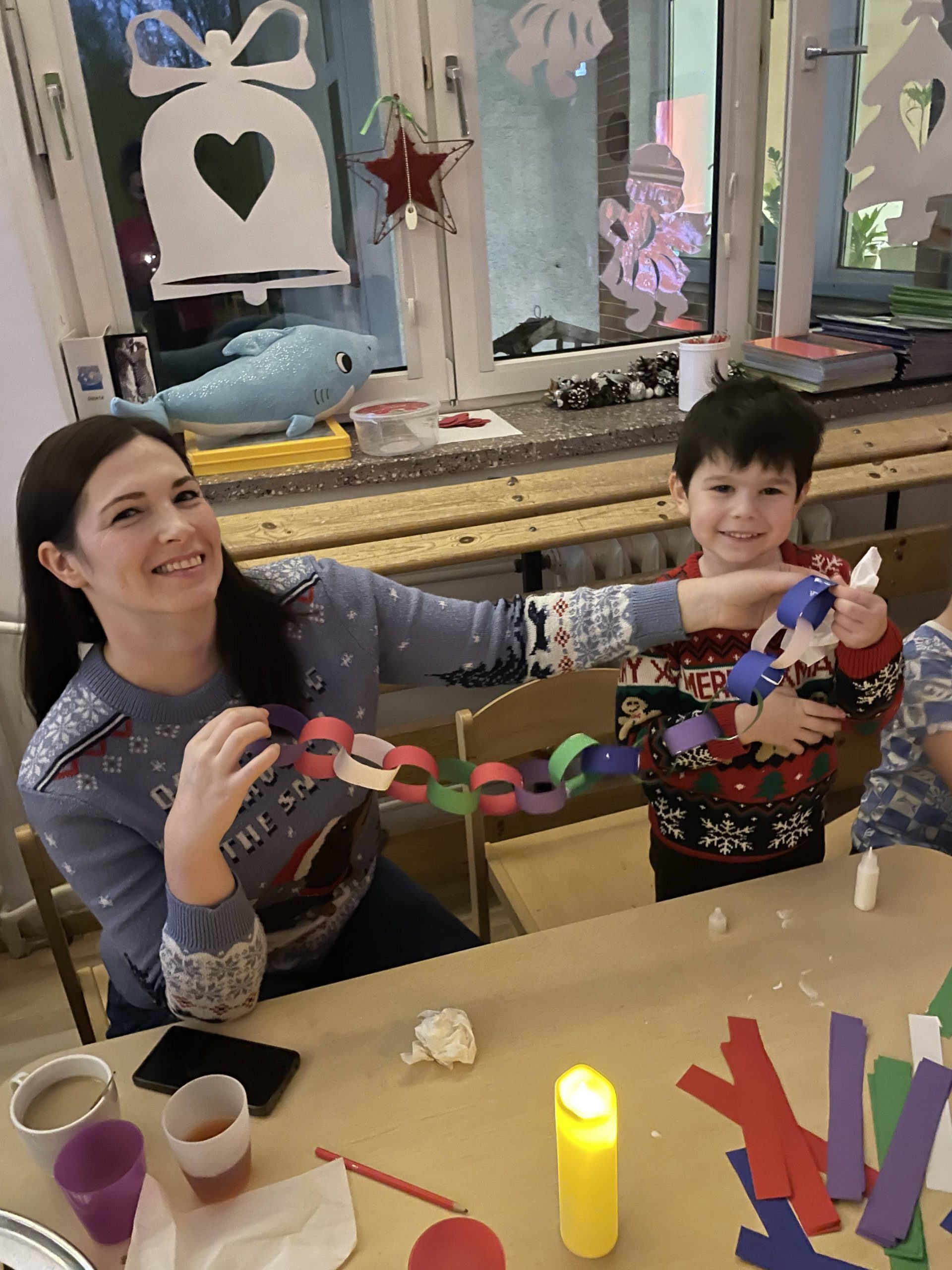 Największym wyzwaniem i jednocześnie największą atrakcją warsztatów było stworzenie najdłuższego łańcucha choinkowego. Połączenie sił rodziców i dzieci zaowocowało imponującym łańcuchem, który z dumą zawisł na jednej z choinek